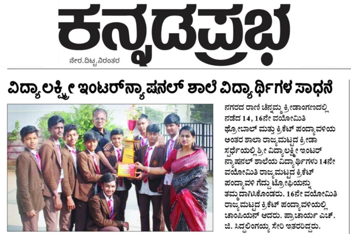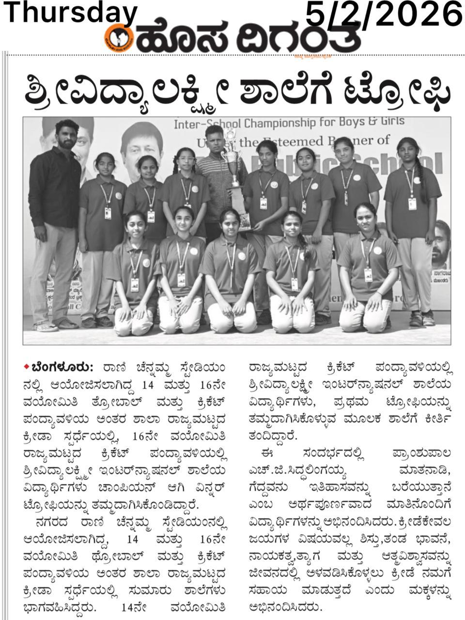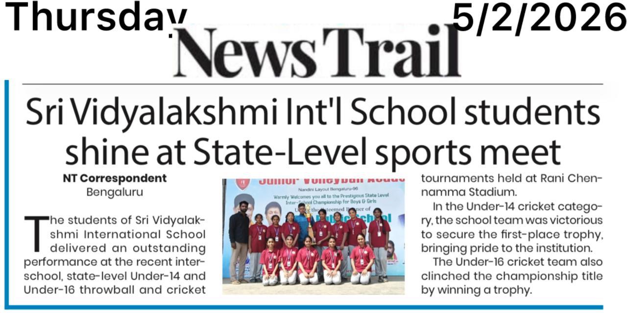 Sri Vidyalakshmi International School students delivered an outstanding performance at the state-level inter-school sports competition, winning championship titles in Under-14 and Under-16 cricket and securing top honours in throwball. Their remarkable achievement brings pride to the institution and reflects the school’s strong commitment to sports excellence.