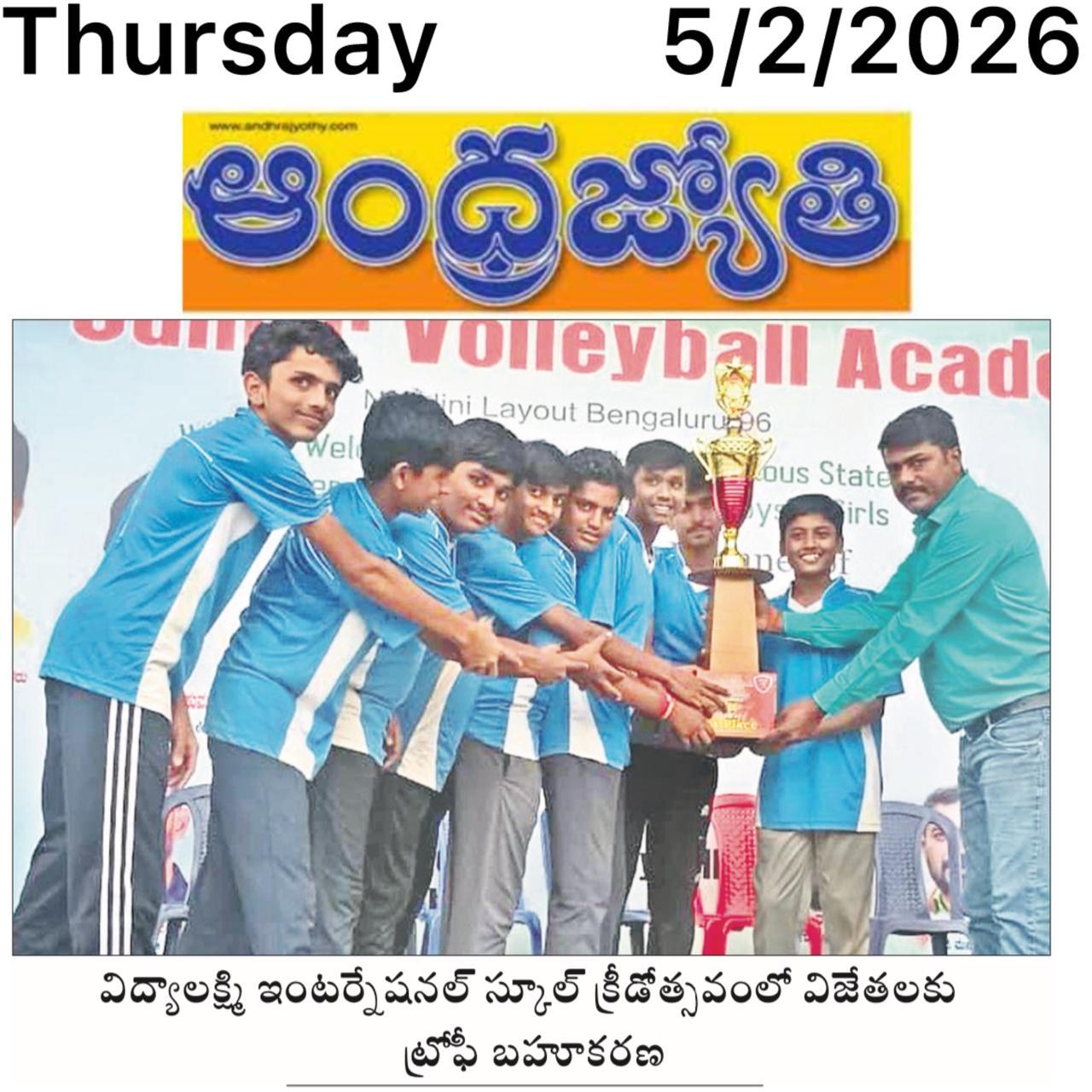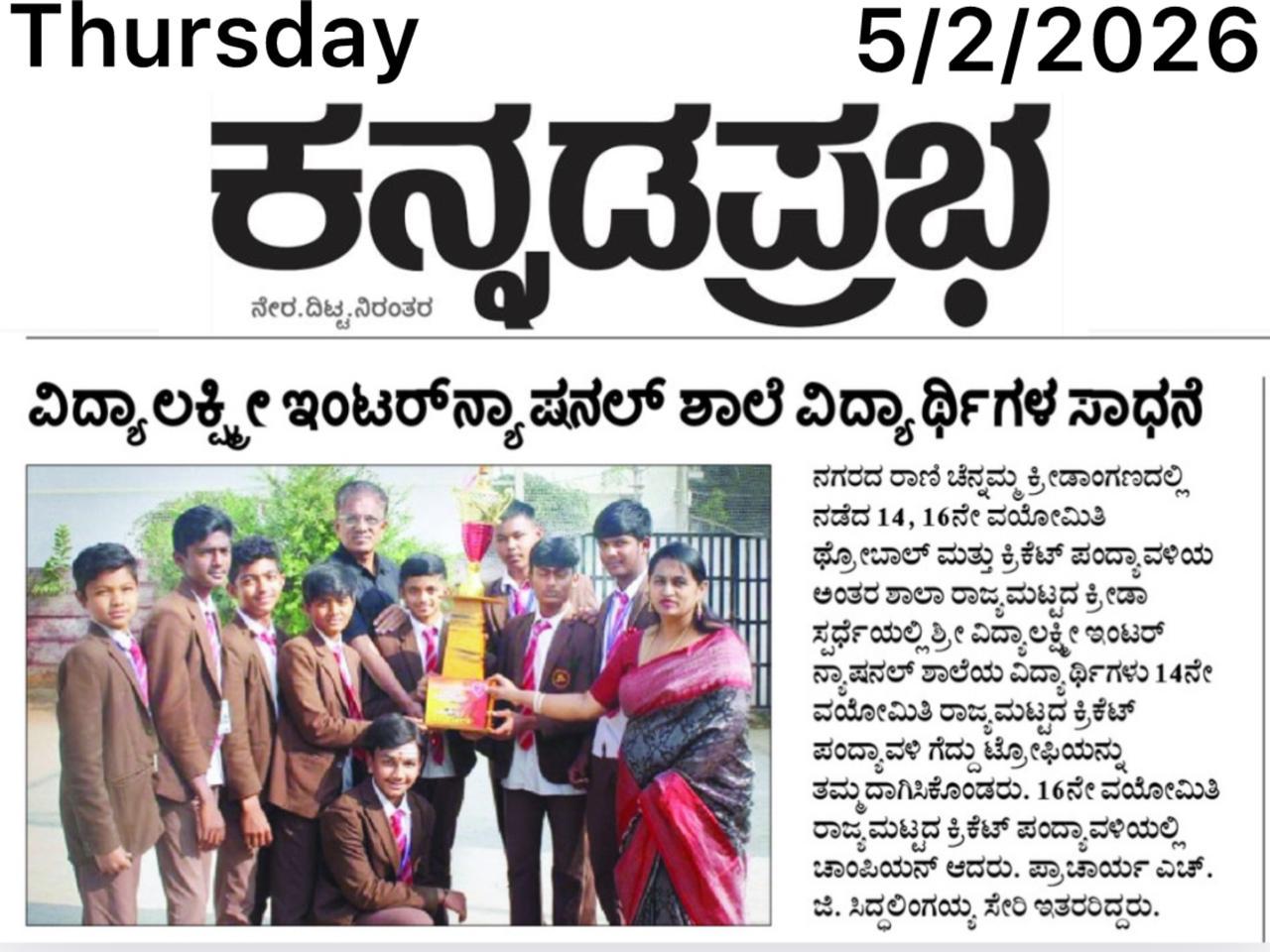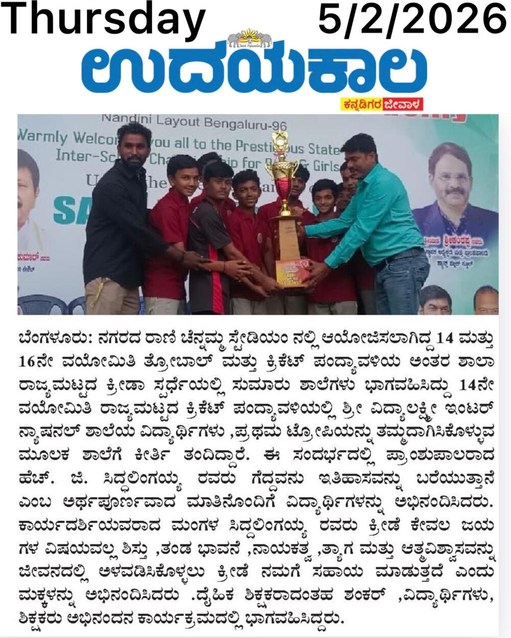 Sri Vidyalakshmi International School students delivered an outstanding performance at the state-level inter-school sports competition, winning championship titles in Under-14 and Under-16 cricket and securing top honours in throwball. Their remarkable achievement brings pride to the institution and reflects the school’s strong commitment to sports excellence.